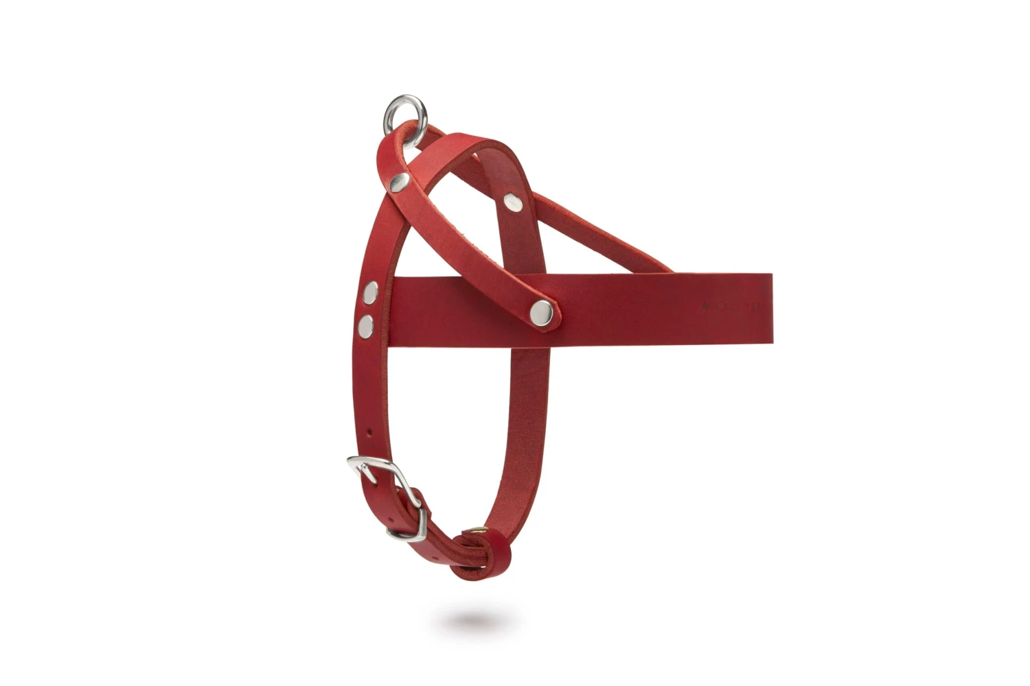 Keep your dog close with wrap-around comfort. This adjustable harness is handmade in Austria with buttery soft, naturally tanned German leather that won’t rub or itch. The Chili Red Harness has a balanced, unrestricted fit with plenty of legroom. Solid brass or steel rivets connect three soft leather loops, and the easy-to-find leash clip is centered on top.