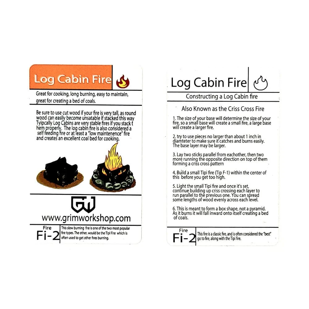 This slim credit card-size tip card features visual and written guidance for building a log cabin fire, as well as its uses and applications. Easily carried in pockets, wallets, or small tins, it’s a great resource for any fire-builder.