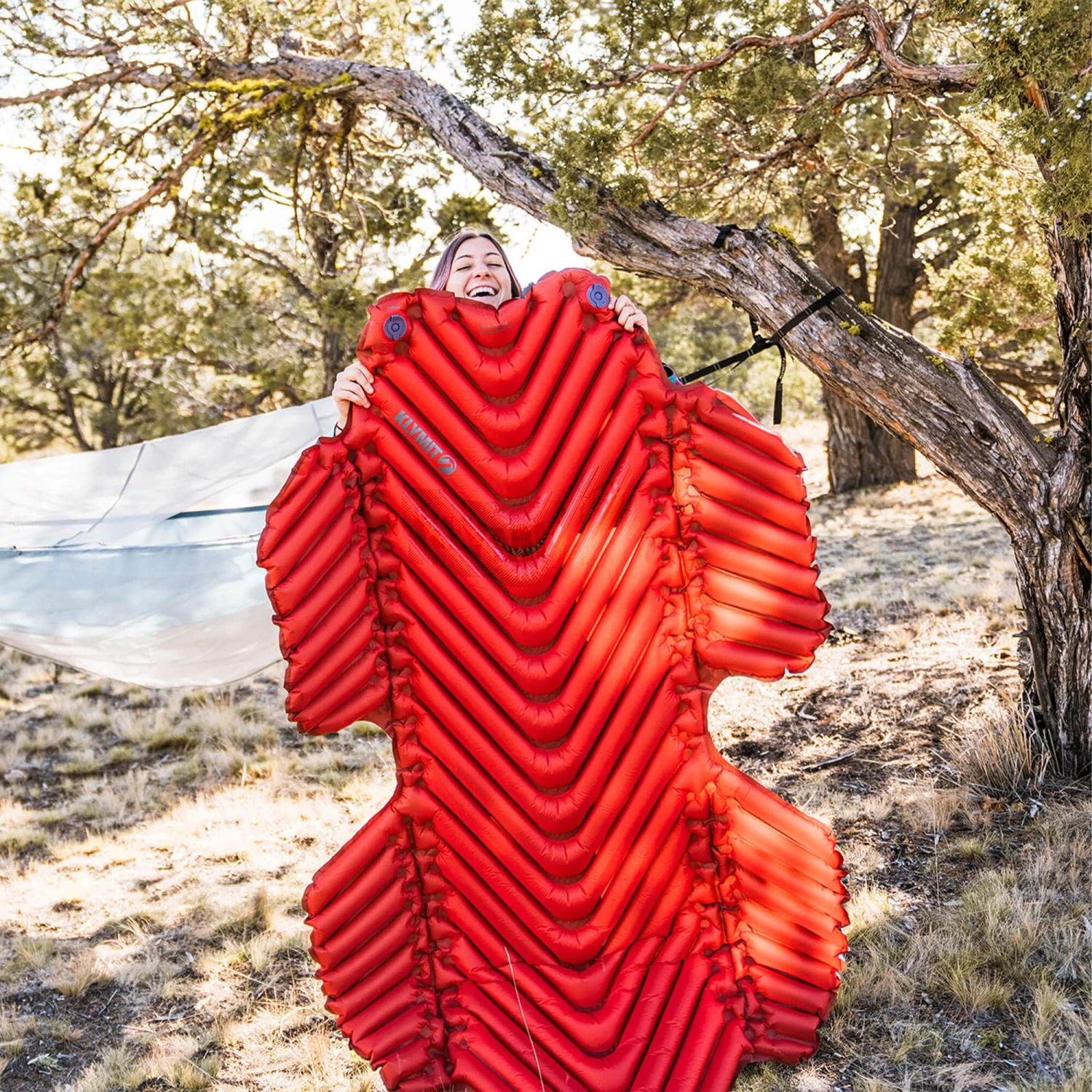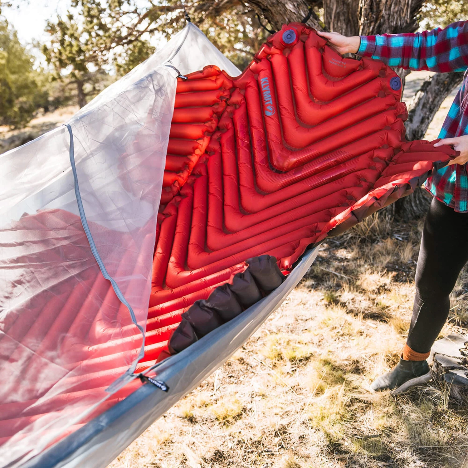 Klymit’s signature body-mapping technology and strategically placed non-slip zones hold the Insulated Hammock V pad in place while you sleep. The form fitting design wraps the body to create a barrier that prevents cold from creeping in from the bottom or sides and the Klymalite™ insulation separates the top and bottom halves of the pad, isolating the cold air on the bottom while keeping the warm air next to your body. Lightweight and compact, the Insulated Hammock V is easy to pack and inflates faster than you can hang your hammock.
