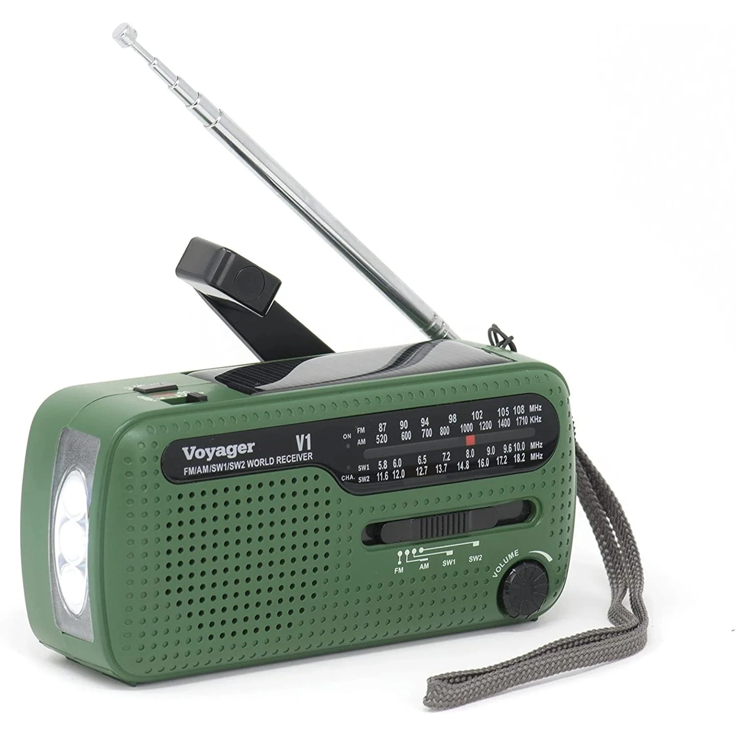 The Voyager V1 is a portable emergency radio with AM, FM and Shortwave bands. It can be powered by a replaceable internal rechargeable battery pack(included), AAA size batteries(not included), solar panel, hand crank, or AC/USB power. 1 minute of cranking powers up to 15 minutes of radio listening or 1 hour of light. A built-in USB port lets you charge your small USB-rechargeable devices, like smart phones (Does NOT charge apple products). It also has a super-bright 3-LED flashlight built in, an HD speaker and an earphone jack.