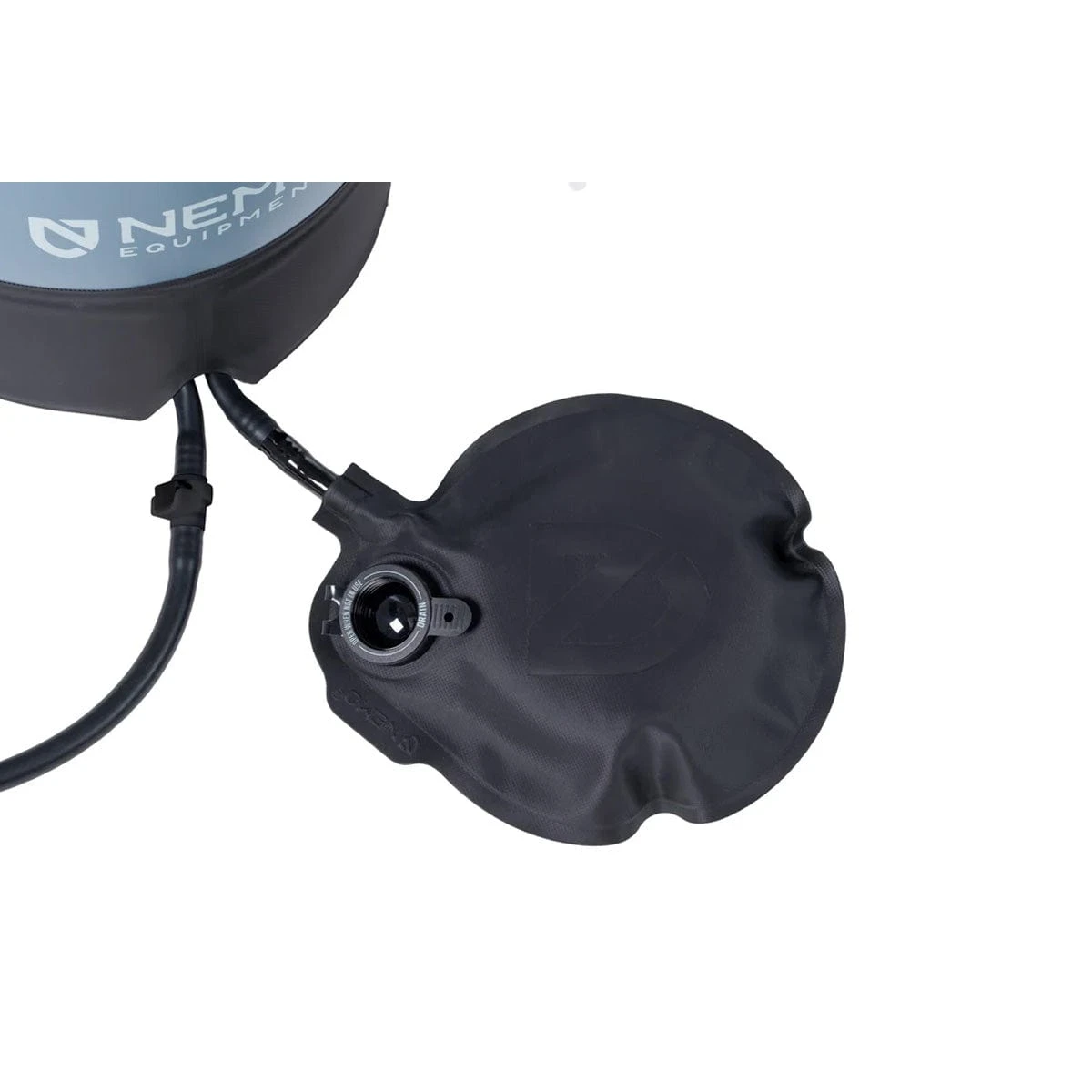 Helio’s 2.9-gallon vertical reservoir is equipped with a large port and easy-grip screw cap for effortless filling and emptying of the tank. (Bonus: The large opening aids with fully drying and cleaning the interior, as well.) Attached to the reservoir is a 7-foot-long neoprene hose with two-stage nozzle that can be manually triggered or set to continuous spray mode for tasks like showering or camp dishes. The extra-long hose is designed to especially complement our Heliopolis™ privacy shelter & shower tent, which has a fitted nozzle holder for a hands-free shower experience for luxury in the backcountry.