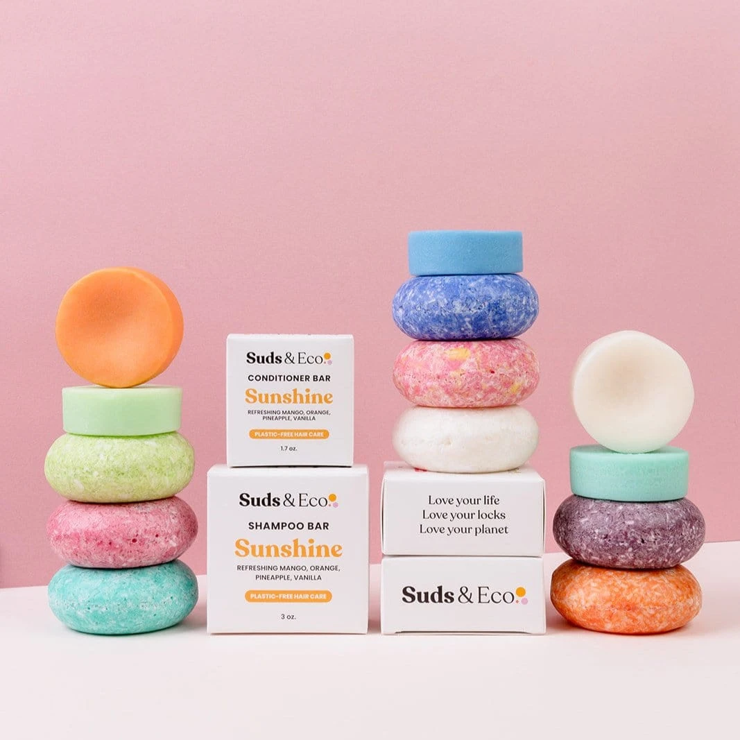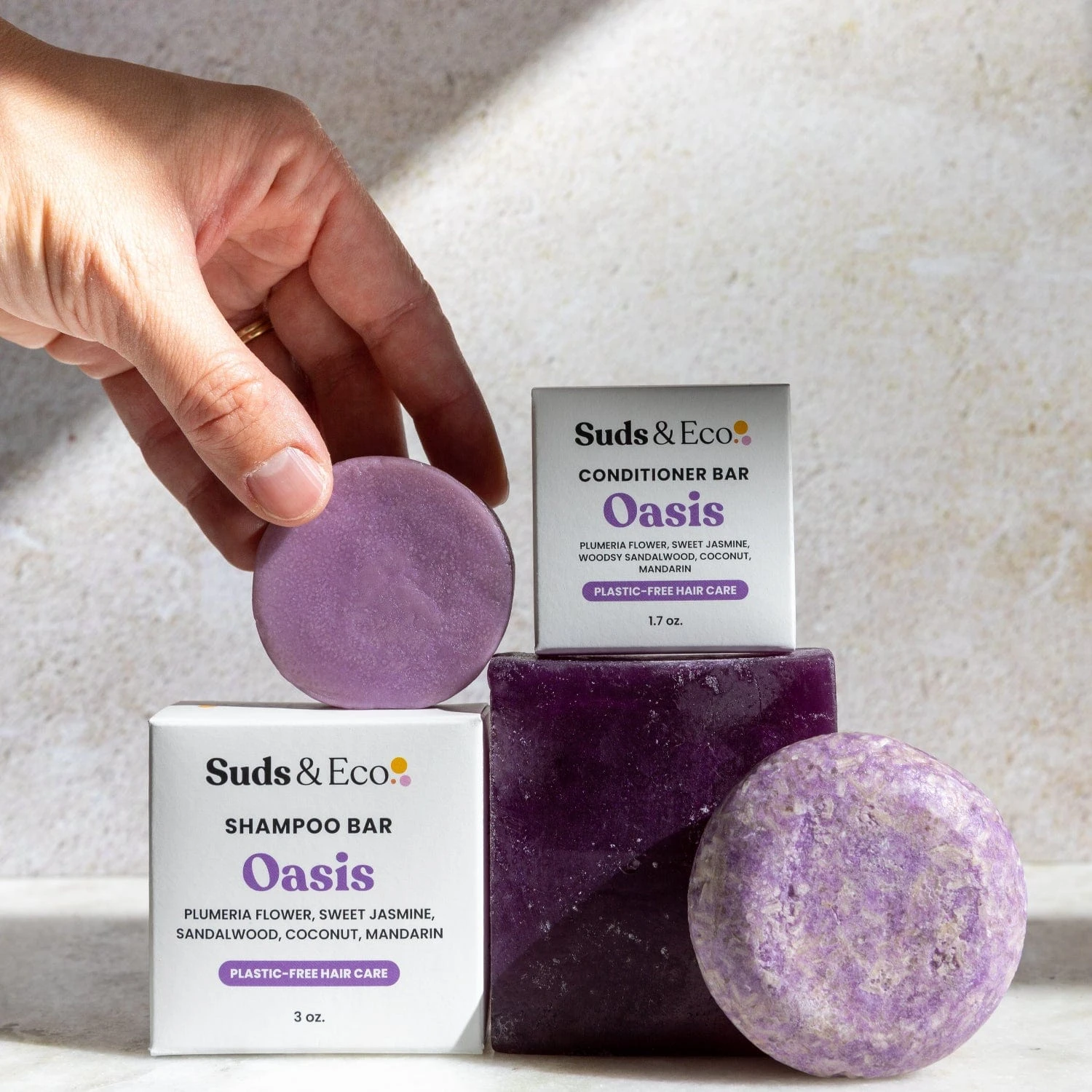 Our #1 best-selling, zero waste Shampoo & Conditioner Bars are made with salon-quality ingredients and teeming with an abundance of intoxicating oils and vitamins. Each nutrient-packed bar naturally removes buildup, promotes fullness, and leaves your hair soft, tangle-free, and super healthy!